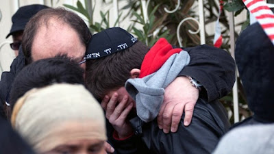 | Mourners outside of a Jewish school in France where 4 people were murdered |
